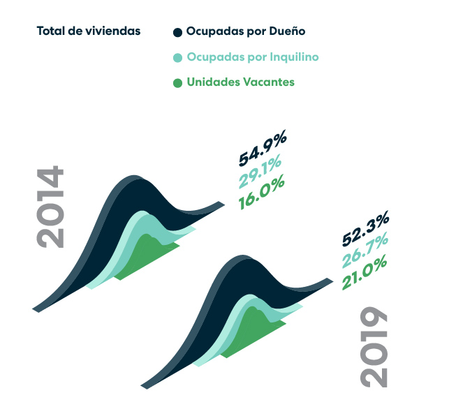 Contrario a la tendencia observada para todo Puerto Rico, el número de unidades de vivienda en Ponce se redujo entre el 2014 y el 2019. No obstante, cónsono con la realidad de Puerto Rico, en Ponce se reflejó un aumento en el número de propiedades vacantes, y una reducción en las propiedades ocupadas por sus dueños.